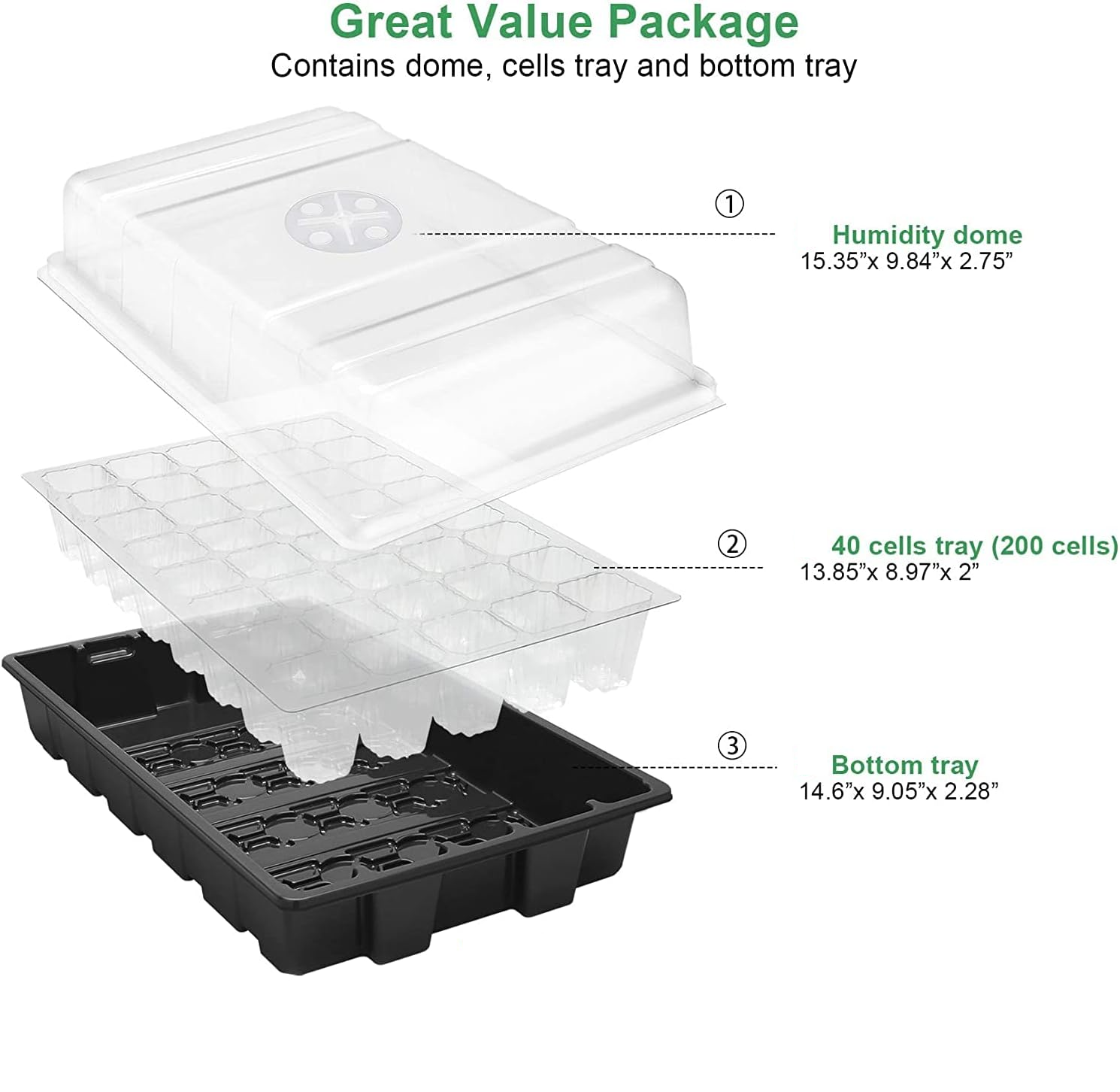 Lea atentamente el tamaño de cada pieza. Tamaño de las celdas: 1.5"x 1.5"x 2" (adecuado para semillas pequeñas); Altura de la cúpula: 2.75"; Tamaño del producto: 14,6 "x 9,84" x 5,1 "