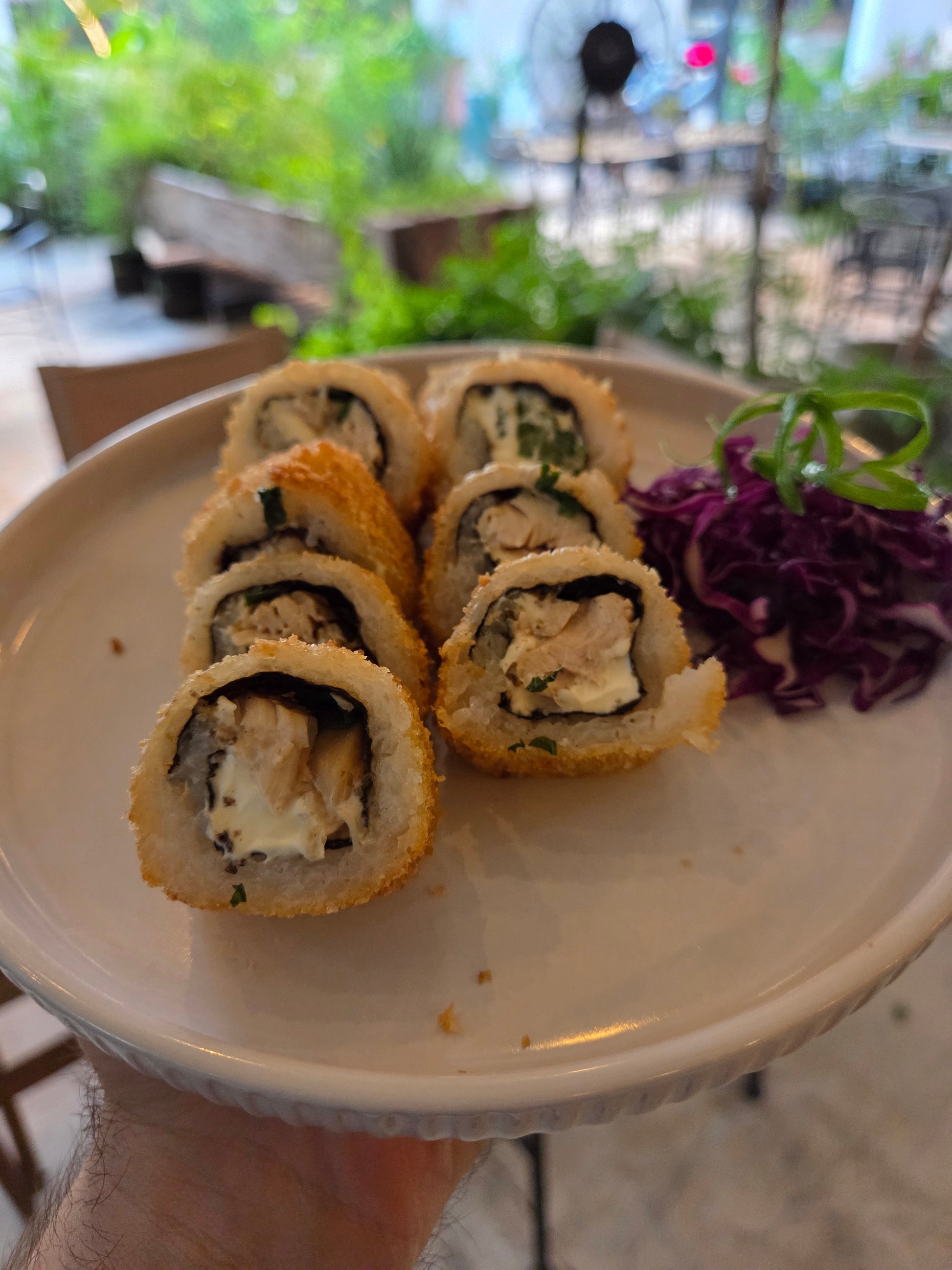 Relleno de queso crema, cebollita y pollo al teriyaki, frito al panko